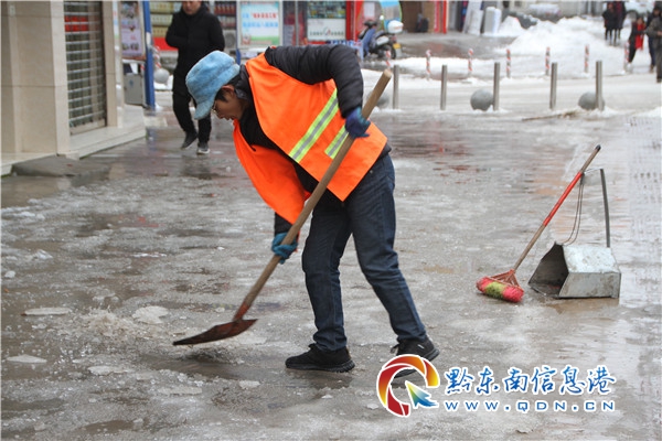 市政局長(zhǎng)駱明貴以身作則,率領(lǐng)職工鏟雪除冰、打掃衛(wèi)生,組織突出隊(duì)加強(qiáng)城區(qū)內(nèi)主干道的搶險(xiǎn)處置工作,激勵(lì)著每一位突擊隊(duì)員。在現(xiàn)場(chǎng),有的揮锨揚(yáng)鎬使勁鏟冰,有的拿著掃把賣力掃雪,有的撿拾垃圾,有的拋撒鹽巴,大家分工協(xié)作,相互配合,干得熱火朝天。