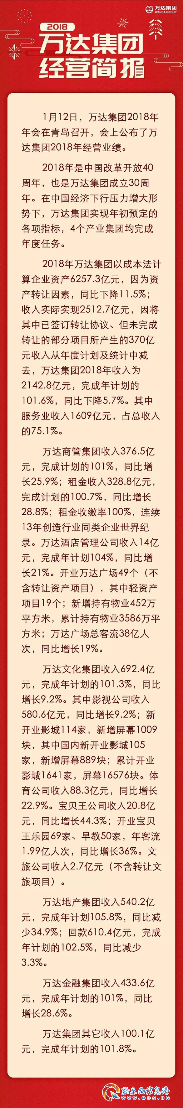2018年是中國改革開放40周年,也是萬達集團成立30周年。在中國經濟下行壓力增大形勢下,萬達集團實現年初預定的各項指標,4個產業集團均完成年度任務。