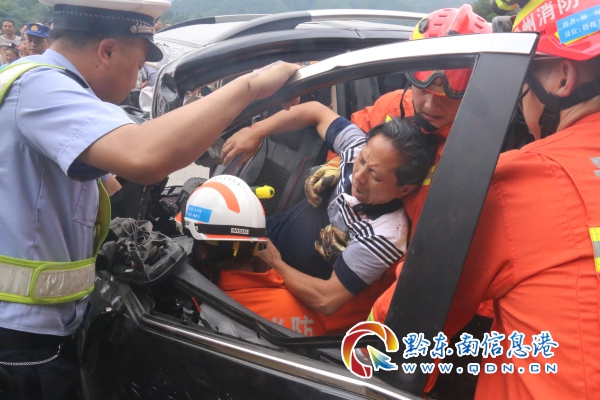 消防指戰員到達事故現場后,發現一輛小轎車和一輛貨車迎頭相撞,小轎車車頭嚴重變形,駕駛員下半身被牢牢卡在儀表盤和方向盤下,不能動彈,另外2名受傷乘客在消防員達到時已被送往醫院救治。根據現場情況,警戒組立即對現場實施警戒和疏散圍觀群眾,救援組一邊安撫被困人員,一邊利用液壓擴張器和液壓頂桿對駕駛室進行破拆。