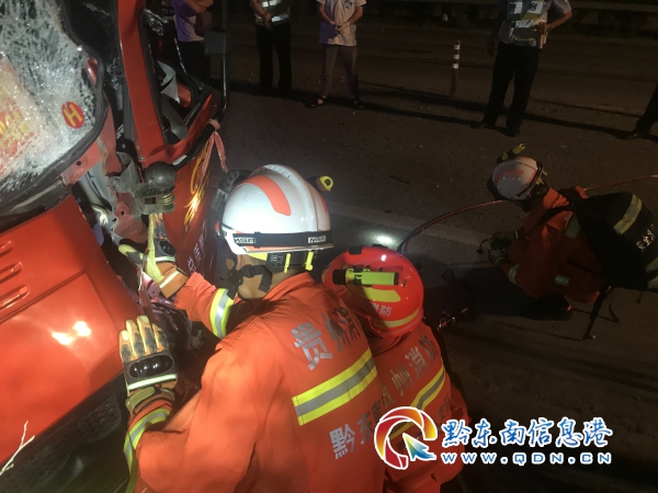 消防指戰員到達事故現場后,經過現場偵查,事故現場為一輛運輸楊梅的大貨車撞向護欄,車頭嚴重變形,右邊兩個輪胎卡在排水溝上,指戰員首先查看了被困人員傷勢并對事故現場進行進一步分析。隨后,指揮員下達指令:先用輪胎墊板先把輪胎墊住,一名指戰員到車頭隨時觀察被困人情況,其余人利用液壓破拆工具對車門進行破拆,經過10多分鐘的救援,成功把被困人員救出,并交給現場醫護人員。