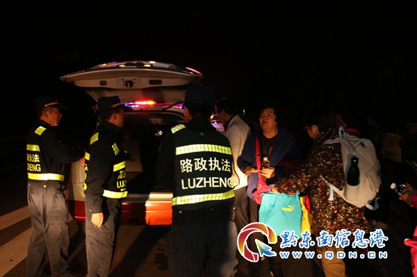 此時(shí),夜幕降臨,霜降后更是秋風(fēng)蕭瑟,在無(wú)助、寒冷、饑餓中,看到路政員們的到來(lái)車上的乘客一下子就涌了下來(lái),眼里的期盼,話里的感謝,真摯而溫暖。與導(dǎo)游一番溝通了解后,在路政員的護(hù)送下,安全將旅游大巴上的乘客轉(zhuǎn)移至就近鎮(zhèn)上。
