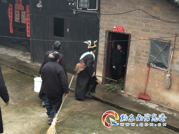 上午9時, 米薅村里德高望重的寨老,召集村里其他寨老帶上祭祀用的物品,一同來到村里的古井。進過一番簡單的祭奠方式后,一一對各家進行“掃寨”。“今天來到你家,-你要教育好家人,出門要注意滅火,教育娃娃不要亂玩火,谷米豐收進倉,生活有保障,F今日子好,黨的政策好,家家用了電,電是好東西,出門要注意,走前撥電器,你家才順利......”