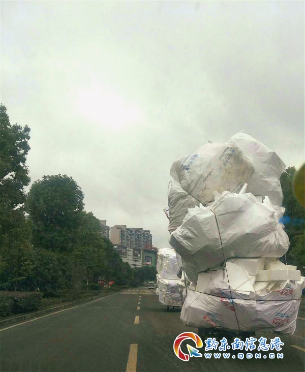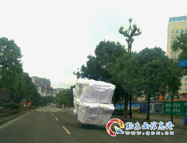 本網訊 (記者 王曉) 今日上午11點50分許,兩輛“身材瘦小”的三輪車運輸“高大上貨物”從凱里迎賓大道蝴蝶谷段路過,嚇得過往車輛紛紛避讓。