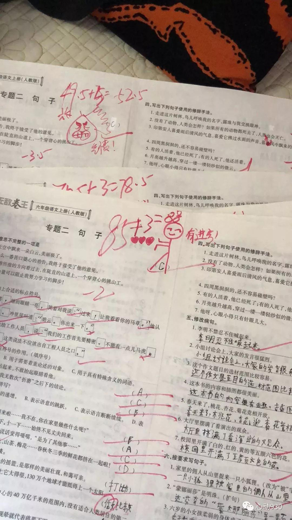 這名女老師名叫胡曉瑾,是凱里第十小學(xué)六年級(jí)語文老師,已從教23年。當(dāng)天,胡老師在批改所任班級(jí)語文句子專項(xiàng)測驗(yàn)試卷時(shí),對(duì)10多名她認(rèn)為是進(jìn)步、保持及退步的典型學(xué)生,在給予分?jǐn)?shù)之后特意在試卷上畫了可愛的卡通畫,寫并“有進(jìn)步、保持、錯(cuò)太多了、退步了、氣憤……”等等句子;對(duì)于字句寫得工整的標(biāo)上“+”另,不工整則標(biāo)上“-”號(hào)。