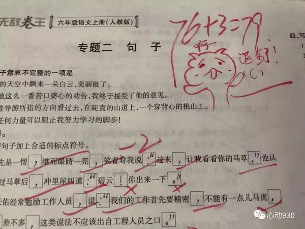 隨后,胡老師將此拍照上了朋友圈。試卷上頗具童趣的卡通畫很快引來了網(wǎng)友們的評(píng)論:“胡老師太可愛了!”、“怎么我們當(dāng)年沒有遇到這么可愛的老師呢?”、“這方式后,能讓娃兒們長記性……”網(wǎng)友們點(diǎn)贊之時(shí),還對(duì)胡老師的這種不失童真的作法給予了肯定。