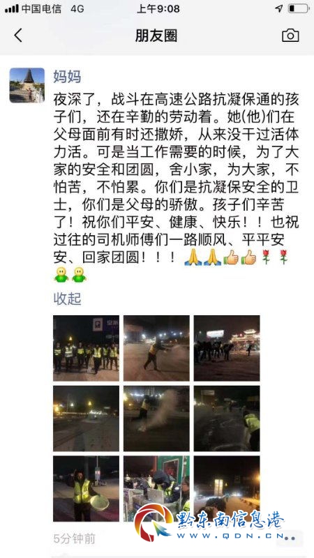 “夜深了,戰斗在高速公路抗凝保通的孩子們,還在辛勤的勞動著。她(他)們在父母面前有時還撒嬌,從來沒干過活體力活?墒钱敼ぷ餍枰臅r候,為了大家的安全和團圓,舍小家,為大家,不怕苦,不怕累。你們是抗凝保安全的衛士,你們是父母的驕傲。孩子們辛苦了!祝你們平安、健康、快樂! !也祝過往的司機師傅們一路順風、平平安安、回家團圓!!”這段有些酸楚卻又十分溫馨的話語來自一位貴州高速先鋒母親的朋友圈,除了簡單的話語,還配上了許多高速先鋒仍然奮戰在一線的照片。這是一位母親對孩子的問候,也是一位母親對孩子崗位的理解,但更多透露出的卻是一位母親對孩子無比的牽掛之心。這是一位母親的心聲,也是無數高速先鋒們家人的心聲,正是因為這份掛念溫暖了我們,才讓我們的高速先鋒們能夠不畏嚴寒,砥礪前行。