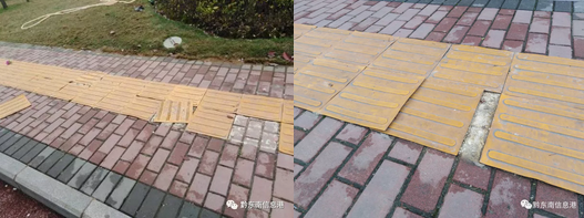 本網訊 (記者 蔡江蘭)近日,記者接到市民金先生反映,他發現凱里蝴蝶谷的人行道上,鋪設的盲道“翹邊”了。“蝴蝶谷這條盲道,采用塑料裁貼工藝,賊滑,還有部分翹邊脫落。別說盲人走了,我走都費勁。”凱里市政部門表示,“翹邊”的“新式”盲道為橡膠制造,是由蝴蝶谷開發商代建,盲道貼是由膠水粘貼,經風吹日曬出現破損,他們將馬上督促蝴蝶谷開發商整改修復。