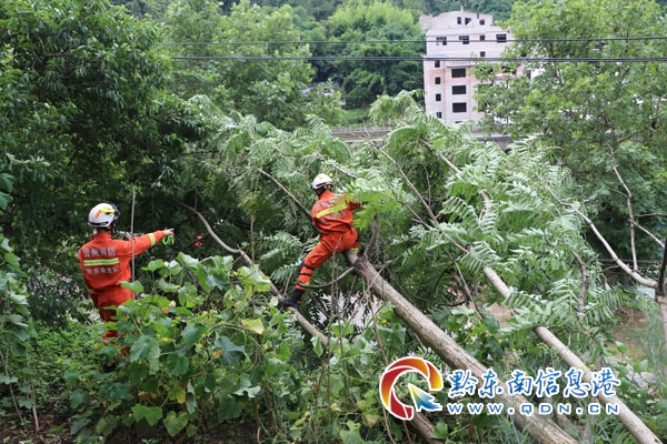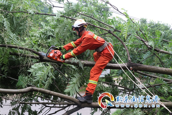 本網訊 6月20日,凱里市消防大隊特勤中隊接到報警,凱里市凱旋廠有一棵大樹被狂風吹到,并且壓在了路邊的電線上,威脅人民群眾安全。接到報警后,特勤中隊迅速出動一個搶險救援編隊前往排除安全隱患。