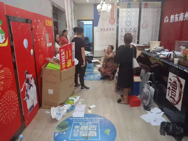 8月28日中午,小編接到電話以后立即趕到這家叫黔狼巢的裝飾公司了解情況。它位于凱里州府路與北京東路的交叉路口處,也就是原凱里鑫麒麟賓館的二樓。在公司的大廳,聚集了許多人,有的坐著,有的站著,還有的躺在沙發上睡大覺。