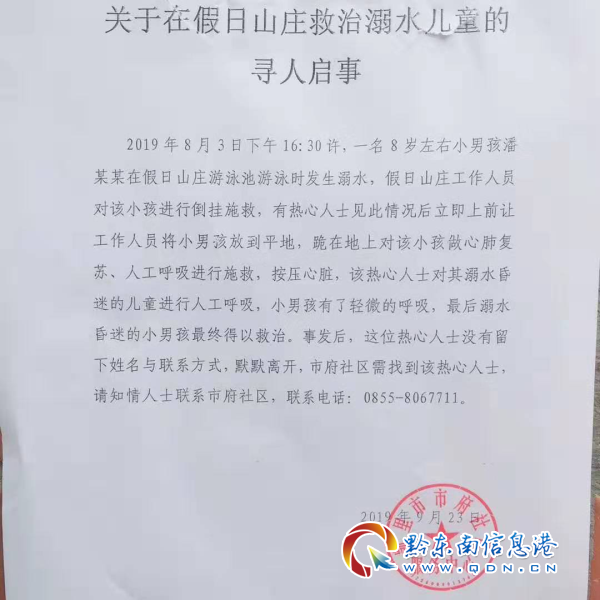 啟事稱,8月3日下午,一八歲男孩在假日山莊游泳池游泳時發生溺水,山莊工作人員對溺水男孩采取倒掛施救時,該熱心人士及時制止,并將溺水男孩平放在地后進行心肺復蘇、人工呼吸救治,溺水昏迷男孩才脫離危險。事后該熱心人士默默離開,未留下姓名與聯系方式。現在市府社區需要找到他,請知情人士聯系市府社區,聯系電話:0855-8067711