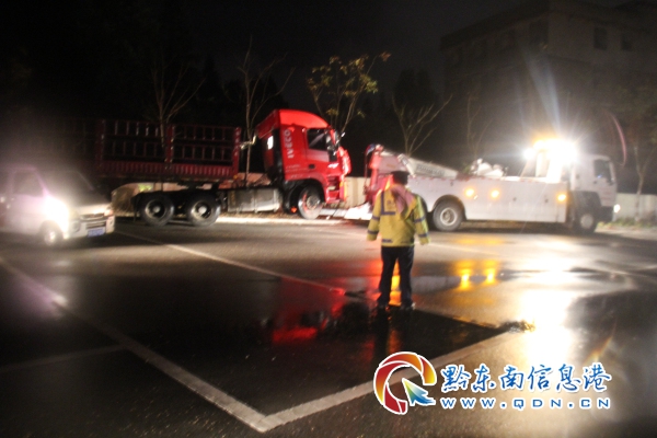 當日14時許,凱里高速公路管理處丹寨路政執法大隊日常路政巡查到 S62 余冊高速 K89+000 互通匝道丹寨往凱里方向時,發現在匝道彎道處熱氣升騰,一輛滿載木材的六軸貨車側翻在匝道左幅,車頭已經側滑出路面,且駕駛室位置已經變形,側翻的貨車旁不時有車輛駛過,情況十分危險。