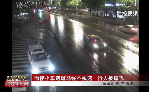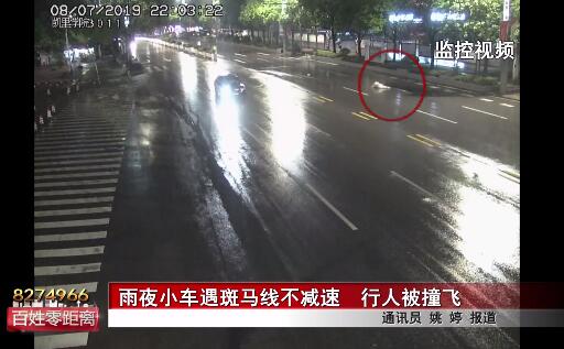 從監控中可以看到,事發時兩名行人正在過斑馬線,當兩人快走到斑馬線中間時,一輛疾馳而來的黑色小車將兩人撞飛,由于雨天路面濕滑,兩人在被撞飛后均滑向了對向車道。