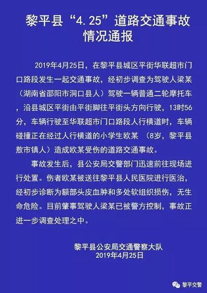 2019年4月25日,在黎平縣城區(qū)平街華聯(lián)超市門(mén)口路段發(fā)生一起交通事故,經(jīng)初步調(diào)查為駕駛?cè)肆耗?湖南省邵陽(yáng)市洞口縣人)駕駛一輛普通二輪摩托車(chē),沿縣城區(qū)平街由平街腳往平街頭方向行駛,13時(shí)56分,車(chē)輛行駛至華聯(lián)超市門(mén)口路段人行橫道時(shí),車(chē)輛碰撞正在經(jīng)過(guò)人行橫道的小學(xué)生歐某(8歲,黎平縣敖市鎮(zhèn)人)造成歐某受傷的道路交通事故。