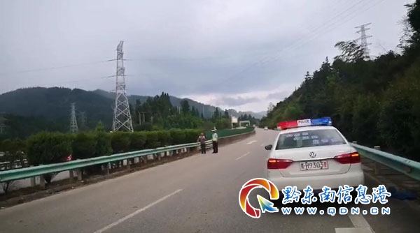 當天16時,黔東南州公安局交警支隊高速五大隊民警巡邏至黎洛高速黎平服務區路段時,發現一位老人拄著拐杖步履艱難地行走在高速公路超車道上,過往車輛疾馳而過,情況十分危險。民警發現后立即將老人攙扶到路邊,在詢問老人的基本情況后,用警車將他安全護送到他居住的地方。