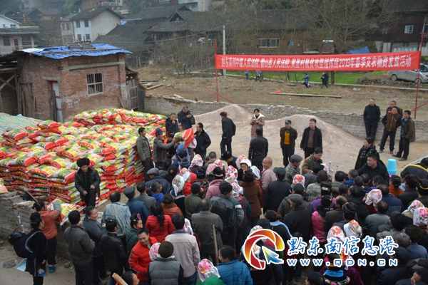 駐村幫扶雷山縣西江鎮黃里村的黔東南州中級人民法院、雷山縣人民法院按照“貴州省發布《2019年脫貧攻堅春季攻勢行動令》,貴州省將縱深推進農村產業革命,堅決打好‘兩不愁三保障’關鍵戰役”的要求,積極籌措資金33200元,2月28日購進“三元復合肥”830包(每包50斤)計41500斤,兩部貨車運來黃里村,分發贈送給全村415戶,每戶2包,解決了農民春耕生產用肥困難問題。同時,黃里村脫貧攻堅指揮所也積極籌措資金14940元,購買1245樣(掃帚、撮合、垃圾桶)的環境清潔衛生掃地工具,分發給全村415戶,每戶一套三樣,讓各家房前屋后環境清潔衛生更靚麗。(張希才 攝影報道)
