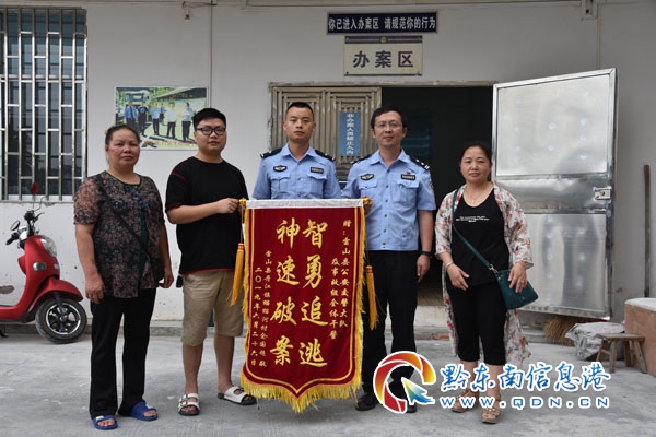 本網訊 近日,雷山縣丹江鎮貓貓河村三組村民余國超的妻兒家屬飽含感激和欽佩的感情將一面繡有“智勇追逃,神速破案”字樣的鮮紅錦旗敬獻給雷山縣公安局交警大隊,感謝雷山交警急群眾所急,為民追逃神速破案。