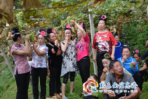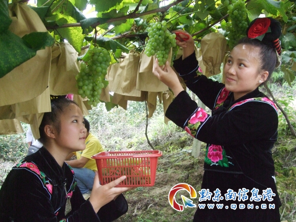 苗家姐妹正在釆摘葡萄上市的情景