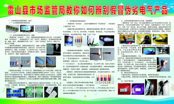 隨著農村電氣質量和消防安全工作的開展,整體狀況得到了較大的改善。要真正減少農民的不必要損失,加快經濟發展,為脫貧攻堅助力,為農民的致富奔小康提供有力的安全保障。為此,雷山縣市場監管局“不忘初心,牢記使命”,自11月以來,積極宣傳引導正確購買家用電氣知識,提高農民對電氣防火的警惕性,增強農村家庭電氣防火安全意識投入到市場服務與監管中發揮了職能作用。
