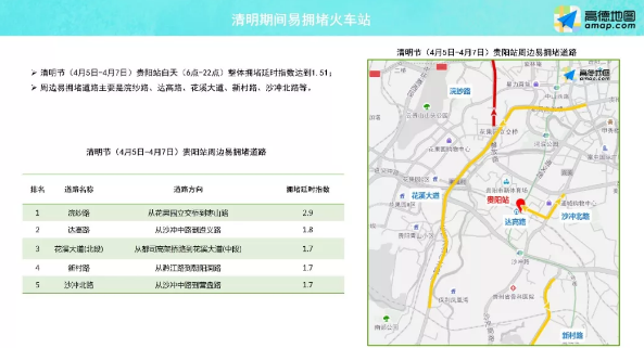 清明節(jié)(4月5日至7日)貴陽(yáng)站白天(6點(diǎn)至22點(diǎn))周邊主要擁堵路段為浣紗路(花果園立交至棗山路)、達(dá)高路(沙沖中路至遵義路)、花溪大道(都司高架橋路至花溪大道中段)、新村路(黔江路至朝陽(yáng)洞路)、沙沖北路(沙沖中路至營(yíng)盤路)。
