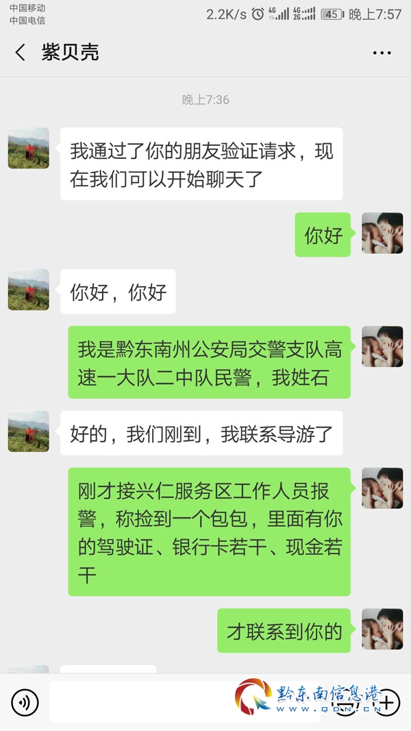 此時通過多方努力,另一組民警順利聯(lián)系到了失主。經(jīng)了解,失主澤女士,一行人是從四川樂山出發(fā)的旅行團,當(dāng)天下午跟著導(dǎo)游從荔波景區(qū)游玩結(jié)束后,轉(zhuǎn)往西江景區(qū)的途中,在興仁服務(wù)區(qū)上廁所時,把錢包隨手放在了洗手間內(nèi),走時忘記拿了。直到在西江景區(qū)辦理酒店入住時,才發(fā)現(xiàn)錢包不見了,但自己也不知如何才能找回錢包。在焦急萬分時,接到了民警的電話。