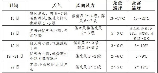 具體預報:16日晴間多云,局部有6~7級偏南陣風,森林火險氣象等級4~5級;17日多云轉陰天有小雨,氣溫下降;18日陰天有小雨,氣溫繼續下降;19~21日陰天有小雨,地勢高處個別鄉鎮有凍雨;22日零星小雨轉陰天到多云,氣溫有所回升。