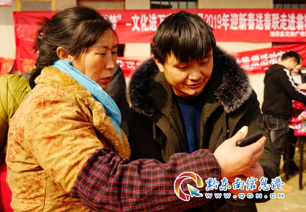 一名群眾用手機搜索春聯內容,請駐村干部書寫