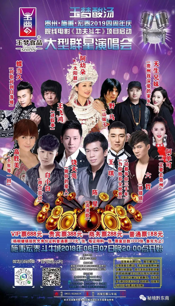 為慶祝端午佳節,弘揚民族傳統節日,豐富廣大群眾精神文化生活,發掘民間民族文化精髓,傳承民族優良文化傳統;促進斗牛文化旅游產業蓬勃發展,打造苗疆優秀旅游品牌商標,施秉縣楊柳塘鎮長田村攜手施秉縣宏泰斗牛文化開發有限公司;貴州飛鴻苗疆影視文化傳媒有限公司;貴州明洋食品有限公司;中視頻道(北京)國際影視文化傳媒。擬定2019年06月07日(農歷五月初五)至2019年06月09日(農歷五月初七)舉辦第十屆“飛鴻功夫牛王杯”端午節牛王爭霸賽暨玉夢酸湯大型群星演唱會,現將活動詳細安排如下: