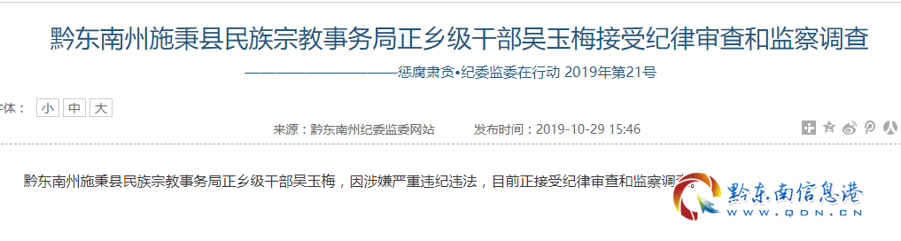 黔東南州施秉縣民族宗教事務(wù)局正鄉(xiāng)級干部吳玉梅,因涉嫌嚴重違紀違法,目前正接受紀律審查和監(jiān)察調(diào)查。