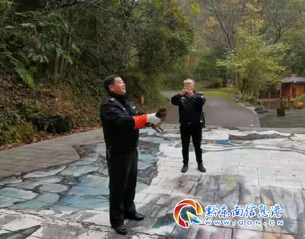 施秉縣森林公安局的民警去到現(xiàn)場看到,原來這只特殊的客人是一只成年貓頭鷹,隨后民警對貓頭鷹進(jìn)行了初步檢查,發(fā)現(xiàn)貓頭鷹健康狀態(tài)良好,在熱心市民的幫助下,施秉縣森林公安局民警帶著這只貓頭鷹回到森林公安局里妥善安置一晚。2019年11月29日早上,施秉縣森林公安局民警便帶著這只貓頭鷹到施秉縣云臺山上進(jìn)行放歸山林活動。