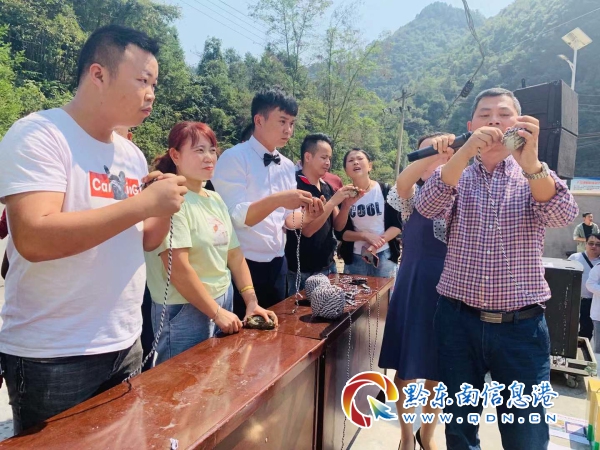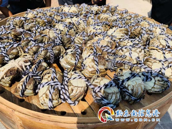 在開捕節現場人頭攢動,三穗縣八弓鎮芭蕉村山花種養殖專業合作社為了答謝各位老鄉,不僅準備了歌舞表演,還進行了一場有趣的“綁蟹”大賽,現場觀眾踴躍參加,與好動的螃蟹展開了一場較量。