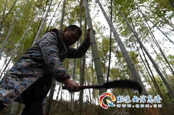 2月13日,在黔東南苗族侗族自治州臺江縣臺拱街道溫泉村大德苗寨,村民正忙著前往后山茂盛的竹林里,挑選上好的竹子作為編扎龍燈的材料,制成竹篾,用鐵絲、布條、木棒、燈等器具物品編扎硬龍,把3至5條細長的篾條扎成龍的脊背,用若千竹圈外粘紅紙剪成的一片片龍鱗甲狀作龍身。硬龍由龍頭、龍尾、龍身三部分組成,全長10余米以上。