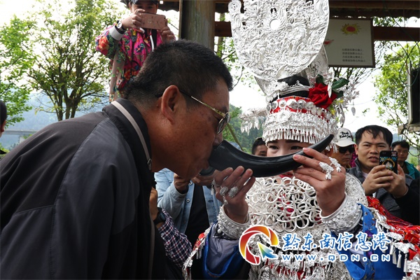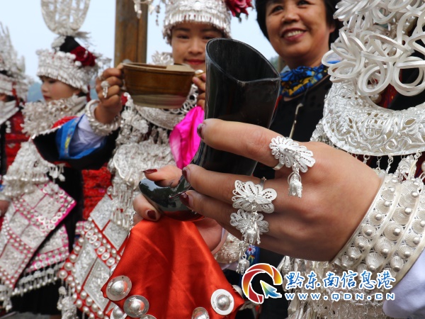 活動當天,八方游客一大早就已聚集于長灘村了,苗家姊妹此時正在家中精心的梳妝打扮。上午10時,身著苗族盛裝的苗家姊妹在長灘村寨門唱響歡迎遠方游客的苗歌,手持牛角杯斟滿了醇香的攔門酒,獻上特色美味的五彩姊妹飯,充分的表達了苗家人的好客之熱情,淋漓的展現(xiàn)了苗家人獨具特色的迎客風俗。
