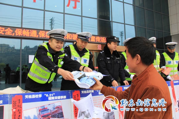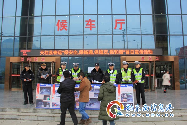 本網訊 1月21日,天柱縣正式進入春運模式,為確保春運期間的道路交通安全,天柱縣交警大隊、縣道路運輸管理局、高速交警天柱中隊、市政大隊、公安局特警大隊、凱運司天柱分公司等有關單位人員,當日上午8點半在凱運司汽車站門口開展以“保安全、保暢通、保穩定、構和諧”為主題的首日宣傳活動。