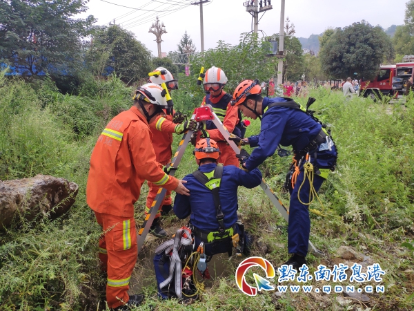 一聲令下后,救援人員迅速展開救援:一名消防員穿戴好個人防護裝備后攜帶救生吊帶,通過救援三腳架下降到了井內。在為被困男子穿戴救生吊帶過程中,為避免被困人員情緒激動,影響救援,消防員把自己的“吉祥物”暫時交由被困男子保管(注釋:在專業救援過程中,安撫被困人員情緒的輔助工具,讓被困人員暫時保管“吉祥物”可以幫助穩定被困人員情緒,方便救援人員進行救援),在救生吊帶穿戴好后,消防員將被困人員抱在懷里,隨上升的救援吊升繩索脫離深井。