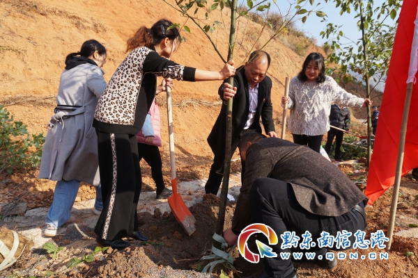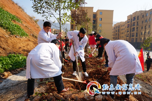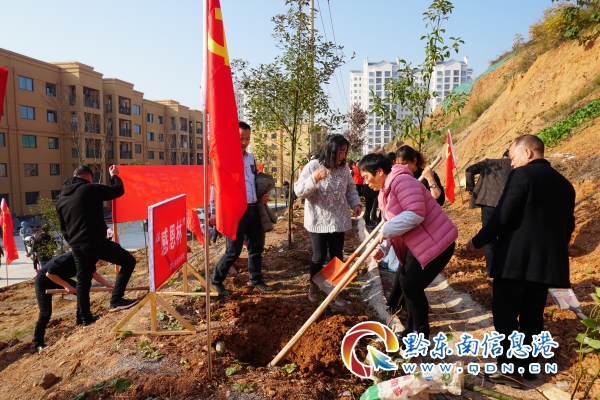 挖窩、栽樹、培土、澆水,大家分工協作,有的放樹苗,有的填土,每個環節都一絲不茍、配合默契,經過兩個多小時的埋頭苦干,一片荒涼的黃土坡披上了綠裝,一顆顆樹昂然挺立,隨風搖曳,仿佛是在向著未來的幸福生活招手。