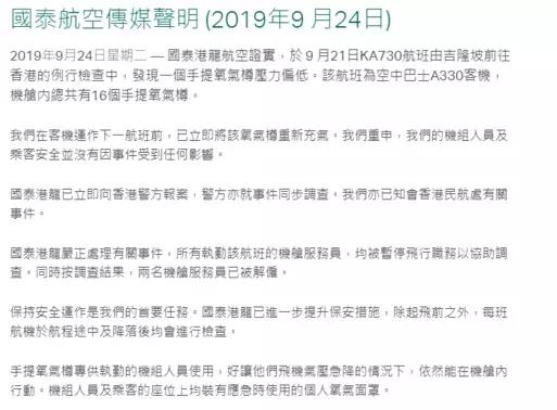 國泰航空表示,在客機運作下一航班前,已立即將氧氣瓶重新充氣,機組人員及乘客安全沒有受任何影響。事情發生后,國泰航空已向警方報案,并已知會香港民航處,警方也已同步展開調查。