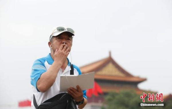 資料圖:一名游客在天安門城樓附近抽煙。 中新社發(fā) 劉關(guān)關(guān) 攝