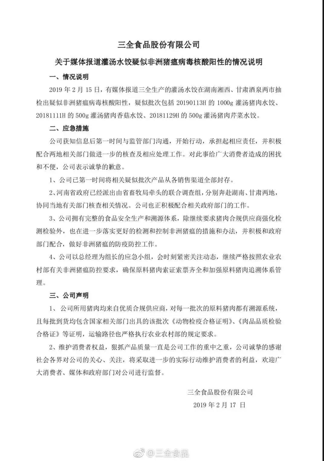 近日,一份來自湖南省湘西土家族苗族自治州重大動物疫病防治指揮部的督辦函在網絡中流傳。據悉,2月9日,通過對湖南省瀘溪縣好又多和萬家福兩家超市共抽取4個批次12份樣品進行檢測發現,三全食品的生產批次為20190113H的“三全灌湯水餃”3份樣品為非洲豬瘟病毒核酸陽性。
