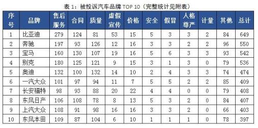 根據報告,從投訴涉及品牌前十名來看,按照投訴量排序,比亞迪位居第一位,第二位到第十位分別為奔馳、寶馬、別克、奧迪、一汽大眾、長安福特、東風日產、上汽大眾和東風本田。