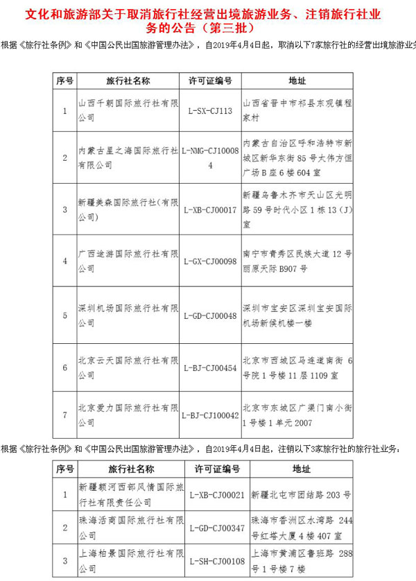 文化和旅游部近日發布公告,取消7家旅行社的經營出境旅游業務,注銷3家旅行社的旅行社業務。記者注意到,截至目前,今年文化和旅游部共取消30家旅行社的出境游業務、注銷11家旅行社的旅行社業務。戳圖看詳細黑名單。(李金磊)