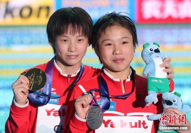 7月17日,中國選手陳芋汐(左)與盧為合影。當(dāng)日,在韓國光州舉行的世界游泳錦標(biāo)賽跳水女子十米臺決賽中,中國選手陳芋汐以439分奪得冠軍,中國選手盧為以377.80分獲得亞軍。韓海丹 攝