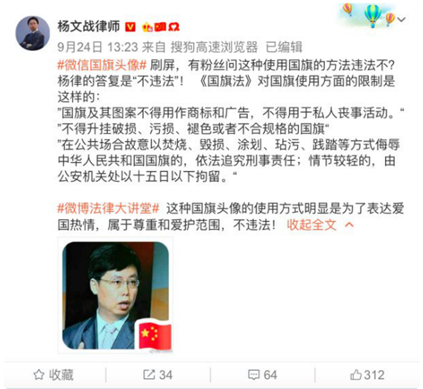 陜西省西安市司法局官方微博也曾表示,只要不是帶有惡意,用國旗做頭像并不違法。