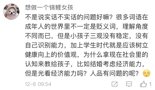 也有網友覺得,出發點是好的,內容在成人看來或許有其“合理性”,但不應該拿來這樣教孩子。