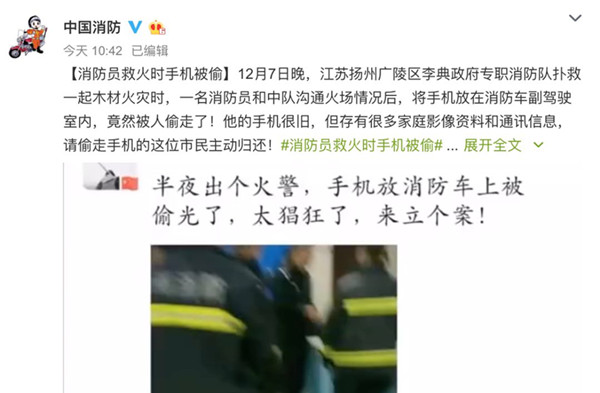 據@揚州消防消息,12月7日晚上,江蘇揚州廣陵區李典政府專職消防隊在撲救一起木材火災時,一名消防員將手機放在消防車副駕駛室內,沒想到竟被人偷走了!