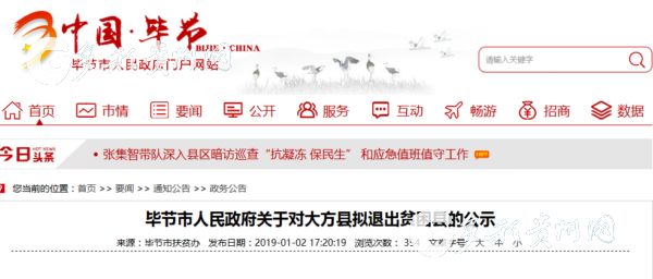 1月2日,畢節市人民政府網站發布了畢節市人民政府關于對大方縣擬退出貧困縣的公示。