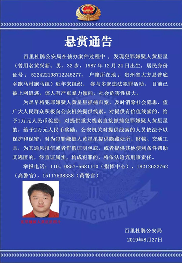 8月27日,百里杜鵑公安局發布懸賞通告稱,該局在偵辦案件過程中,發現犯罪嫌疑人黃星星(曾用名黃興新、男、32歲,1987年12月24日出生,居民身份證號:522422198712245277,戶籍所在地:貴州省大方縣普底鄉跑馬村跑馬組)近年來組織、參與多起違法犯罪活動,目前已被上網追逃。該人有嚴重暴力傾向,社會危害性極大。