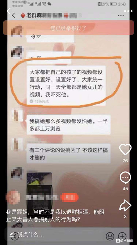 “沒想到,他們又找到了火山視頻,接著罵我。”靜姐說,一名罵她的網(wǎng)友告訴她,這群人為了罵她,惡搞她,還專門建了一個群,帶頭的是一個桂林的女網(wǎng)友。“太無法無天了。群里有50多人,都是女的,她們會商量著用各種手段整我,甚至我女兒。這名網(wǎng)友實在看不下去了,才以退群相威脅,她們才放過我女兒。后來,該名網(wǎng)友也被她們罵得很慘。”