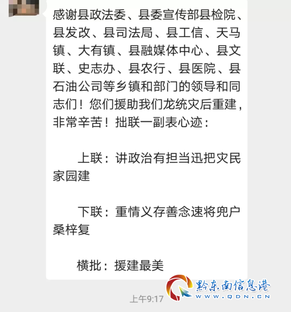 大災面前有大愛,干群同心齊抓災后重建。在開展救災工作中,一幕幕感人的場景不斷涌現,不論是冒著大雨還是頂著烈日,面對重建工作未完成,人民群眾居住環境未得到徹底保障前,工作組一刻也不懈怠,困了、倦了就蹲在瓦堆旁歇息片刻。一滴滴汗水記錄了工作組并肩作戰的瞬間。當地群眾對救災工作十分感激,當救災組到達受災地時,有群眾激動的向工作組說:“你們是共產黨派來的吧?黨的政策真是好啊,謝謝你們”。還有群眾自擬對聯“上聯:講政治有擔當迅把災民家園建,下聯:重情義存善念速將兜戶桑梓復,橫批:援建最美”。這是人民群眾對救災工作的最美評價。