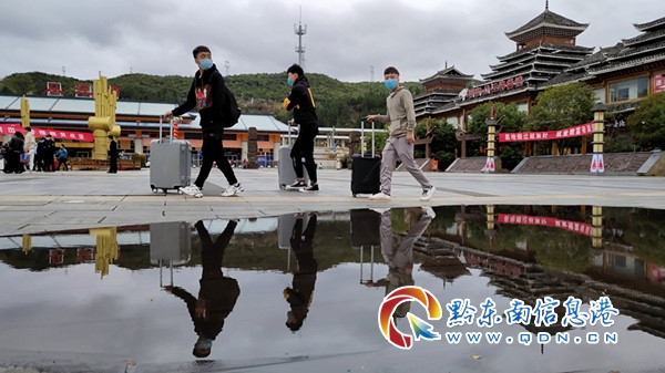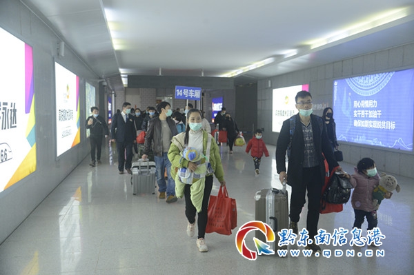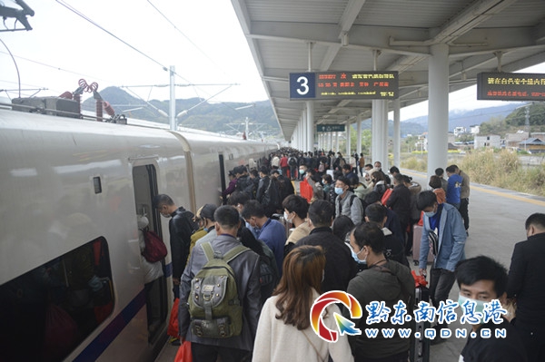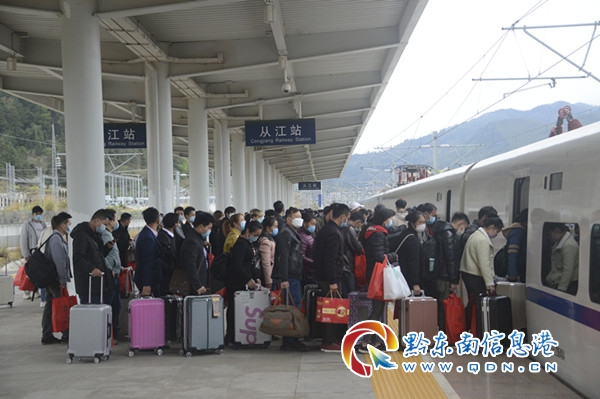 3月1日,在貴廣高鐵從江站,貴州省從江縣第二批輸送外出的611名勞務人員乘上由縣政府給他們提供的免費高鐵專列踏上了返崗的旅途。