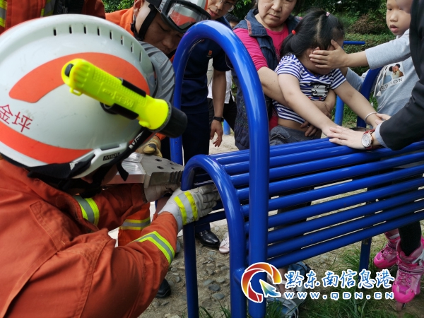 救援人員到達場后發現小女孩的右腳腳腕被卡在了伸腰伸背器上,上半身依靠在奶奶身上以減輕疼痛感。根據現場情況,救援人員決定采用液壓擴張器讓伸腰伸背器“松口”,在經過幾分鐘緊張的救援后,小女孩右腳成功脫困。所幸,小女孩腳部被卡時間不長且消防救援人員及時到場救援,在放松幾分鐘后小女孩已經能正常行走。最后,被困小女孩和家屬向救援人員表達了謝意。